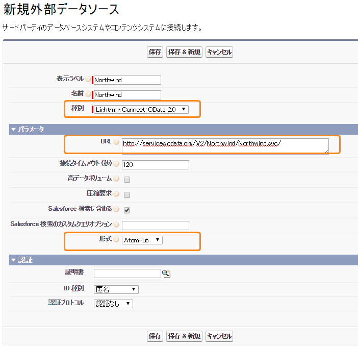 NorthwindサービスをSalesforceで扱うために外部データソースの設定を行います。