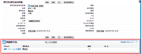 取引先責任者がどの取引先と関連しているかは、取引先責任者の詳細ページへ「関連取引先」関連リストを追加することで見ることができます。