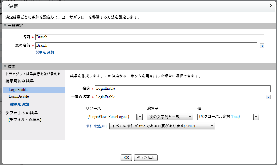 パレットタブのロジックから「決定」を選択し、以下のとおり設定してください。